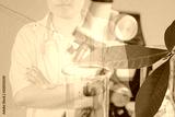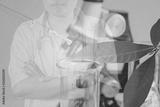 Double exposure pipette dropping above test tube on sample chemical into herbal plants , bio technology medicine research concept.