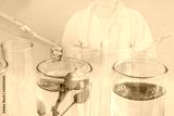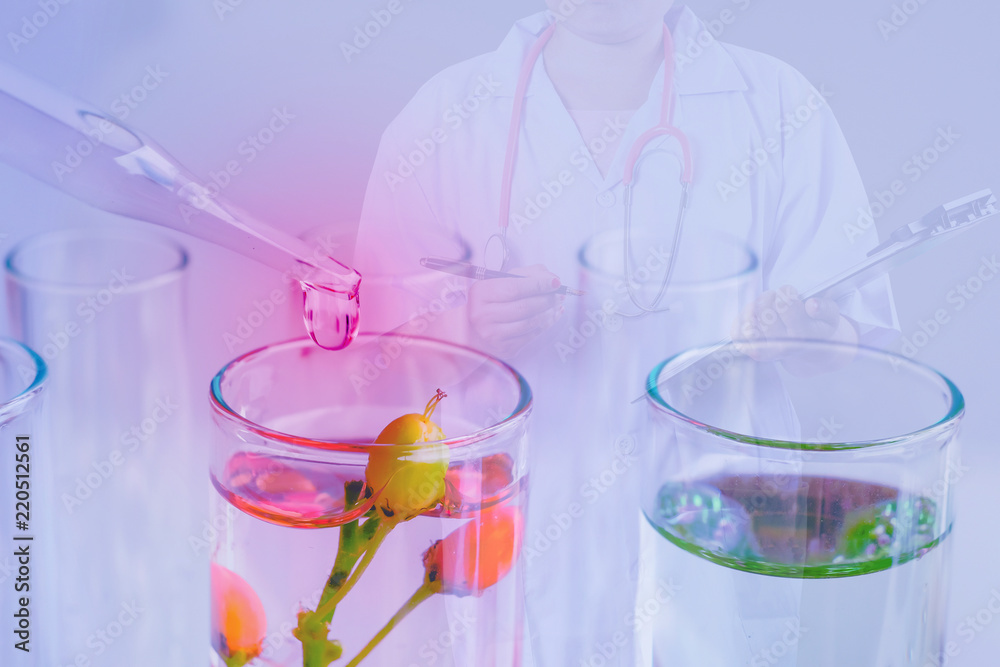 Double exposure pipette dropping above test tube on sample chemical into herbal plants , bio technology medicine research concept.