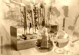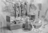 Double exposure Small plants in test tube for biotechnology medicine research.