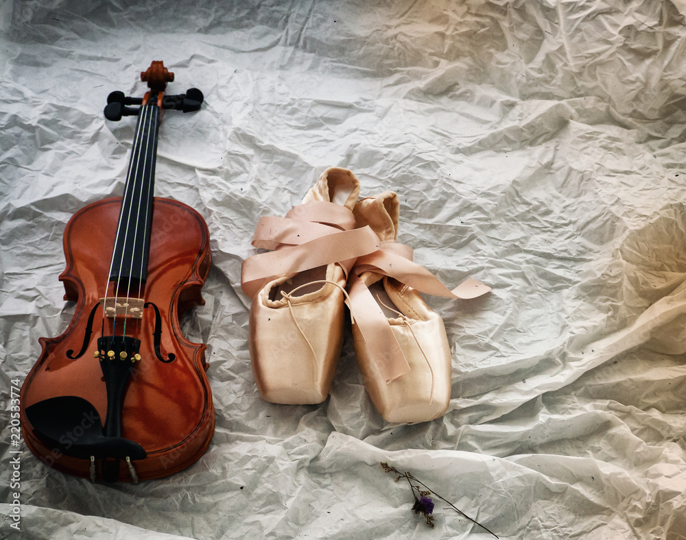 The abstract art design background of violin and ballet shoes put on background,vintage and art style,classice old film tone,blurry light around.