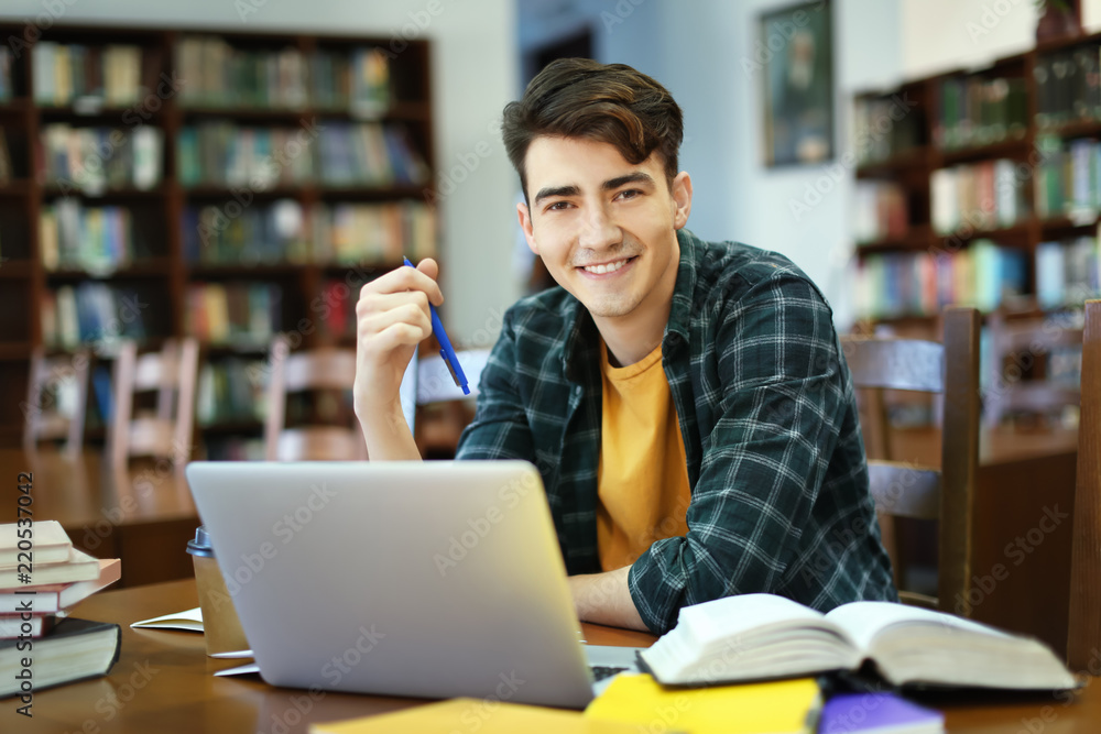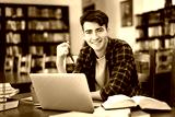 Student with laptop studying in library
