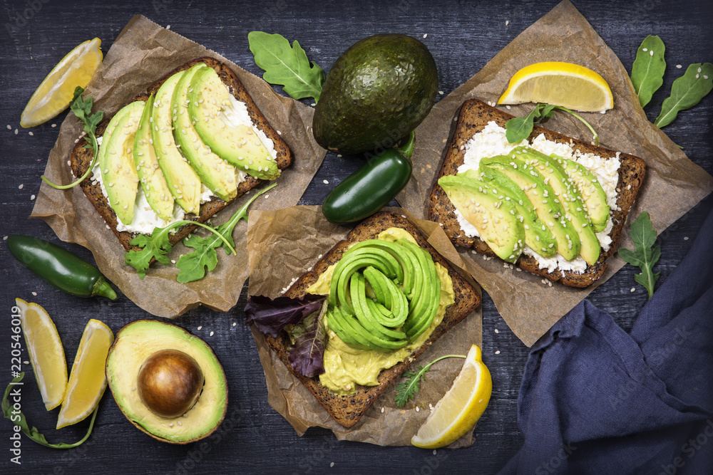 Sandwiches with rye bread and fresh sliced avocado