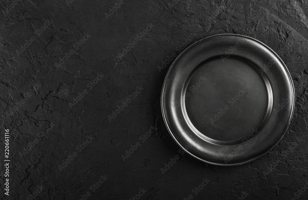 Top view of black empty plate on black stone background. flat lay