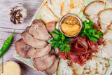 Meat platter with slices ham, pork, beef tongue, beef jerky, mustard, garlic, parsley, bread on plate over wooden background