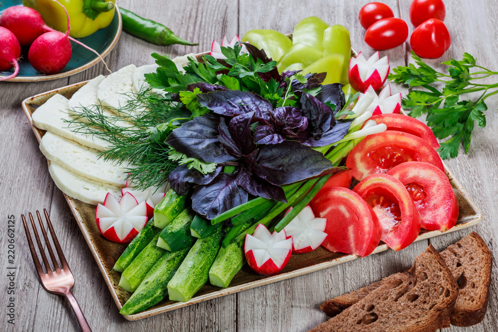 Platter of assorted fresh vegetables and feta cheese on light wooden background. Snacks and Wine appetizers set.