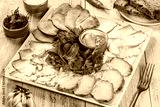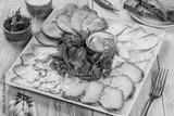 Meat platter with slices ham, pork, beef tongue, beef jerky, mustard, garlic, parsley, bread on plate over wooden background