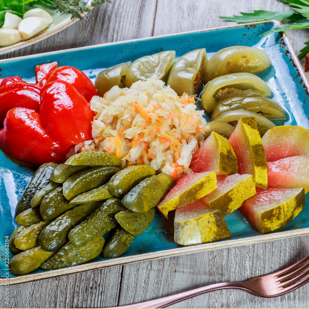 Assorted pickled vegetables - Sauerkraut cabbage, watermelon, peppers, cucumbers, tomatoes and herbs on light wooden background