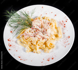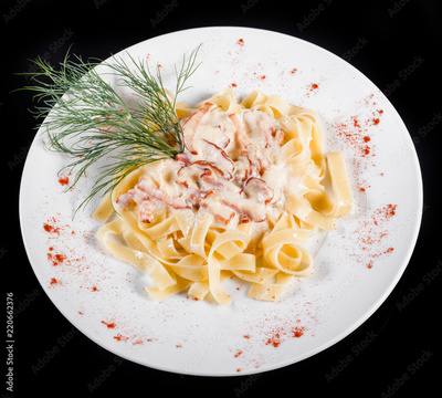 Fettuccine pasta with meat, cream sauce and herbs, in bowl isolated on black background. Italian cuisine. Top view
