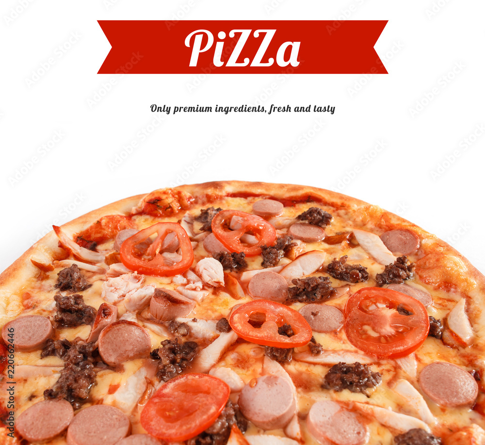 Pizza with ground beef, sausage, ham, tomato and cheese isolated on white. Italian cuisine
