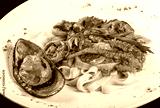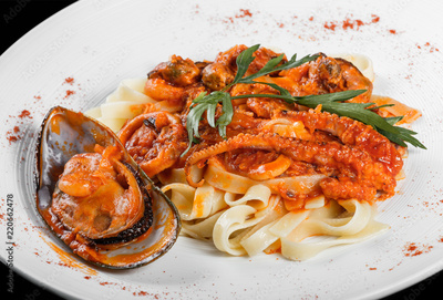Fettuccine pasta with seafood, mussels, octopus, oysters, tomato sauce and herbs, in bowl isolated on black background