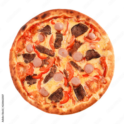Pizza with beef, sausage, frankfurters, sweet pepper, tomato and cheese isolated on white. Italian cuisine