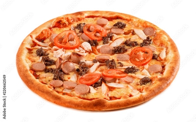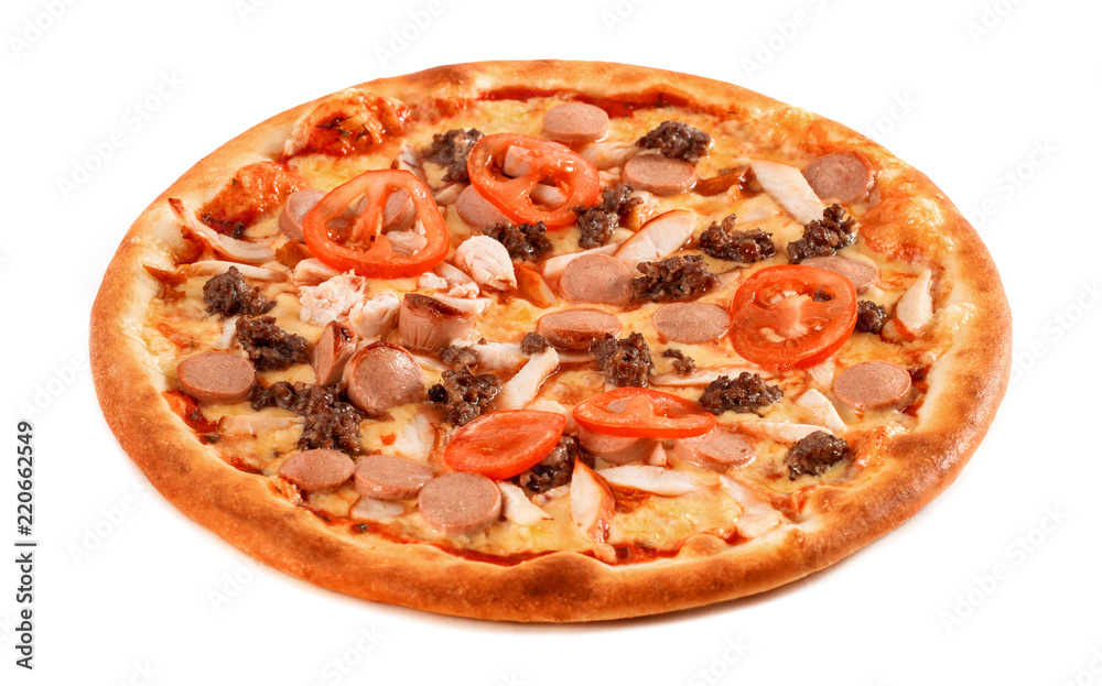 Pizza with ground beef, sausage, ham, tomato and cheese isolated on white. Italian cuisine