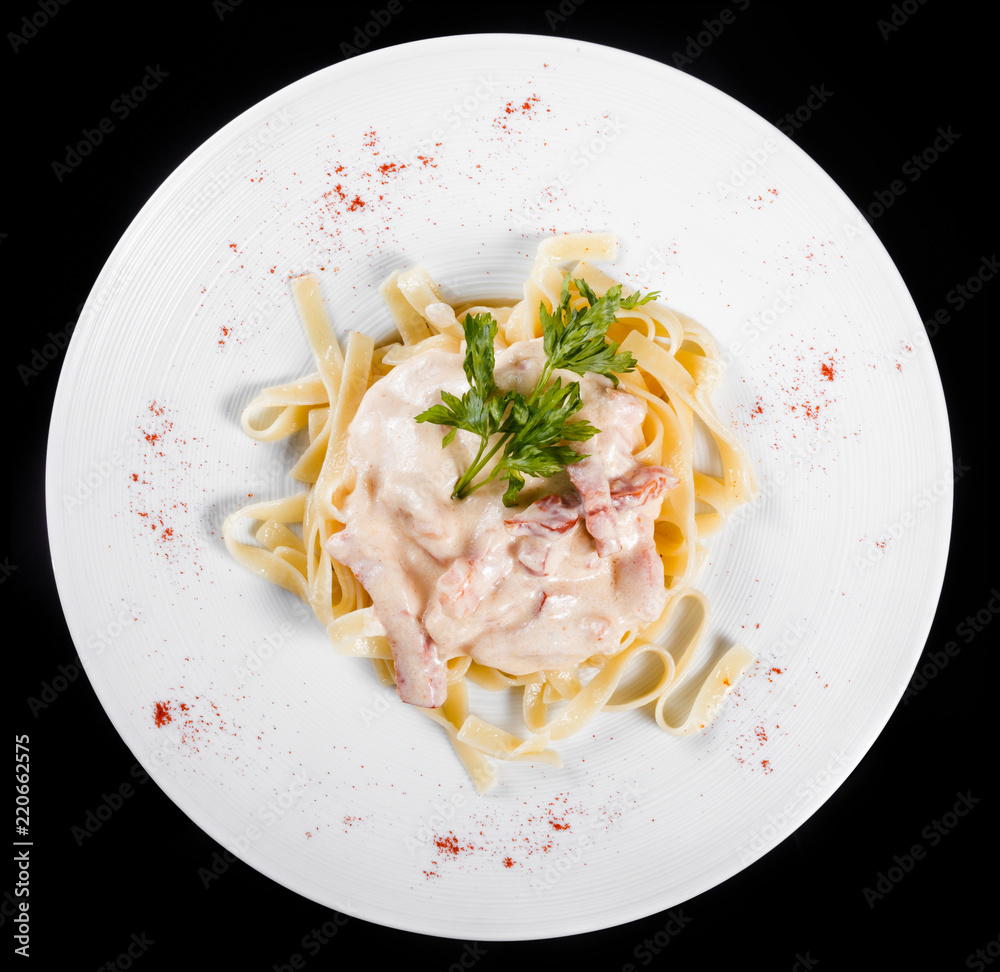 Fettuccine pasta with meat, cream sauce and herbs, in bowl isolated on black background. Italian cuisine. Top view