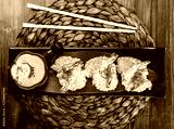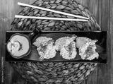 Breaded shrimp with sauce on black plate on bamboo background. Delicious dish of seafood. Top view
