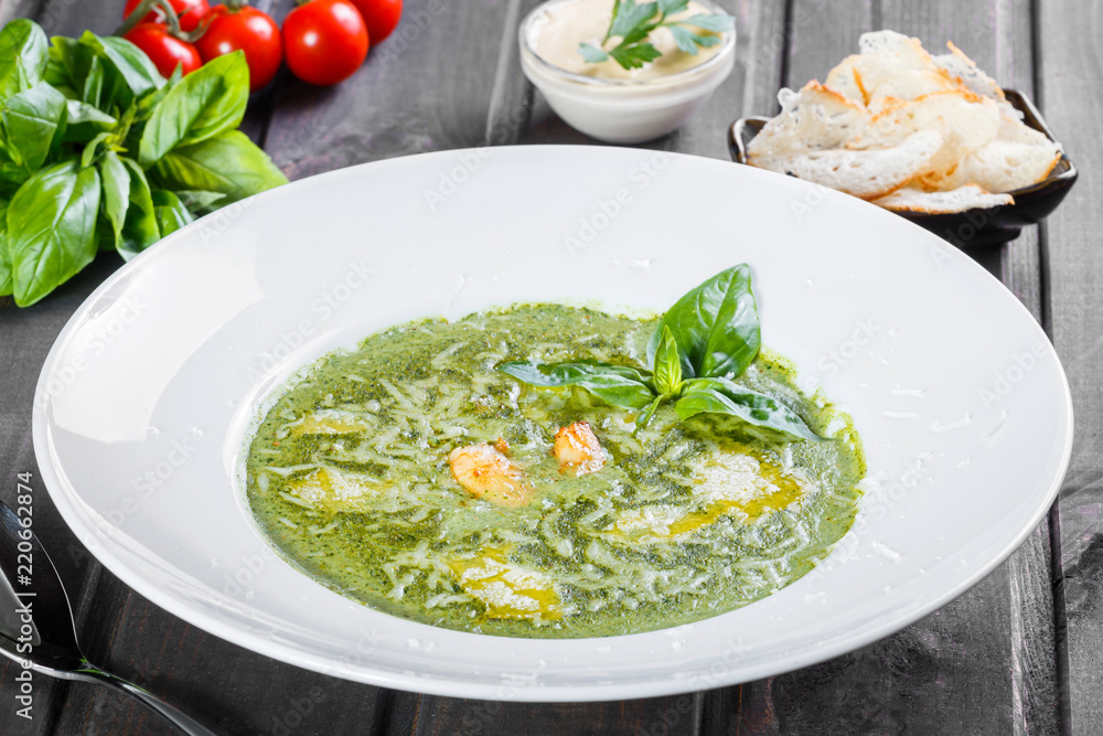 Seafood Soup with shrimp, cheese parmesan, herbs and lemon on plate on dark wooden background. Thai traditional food