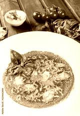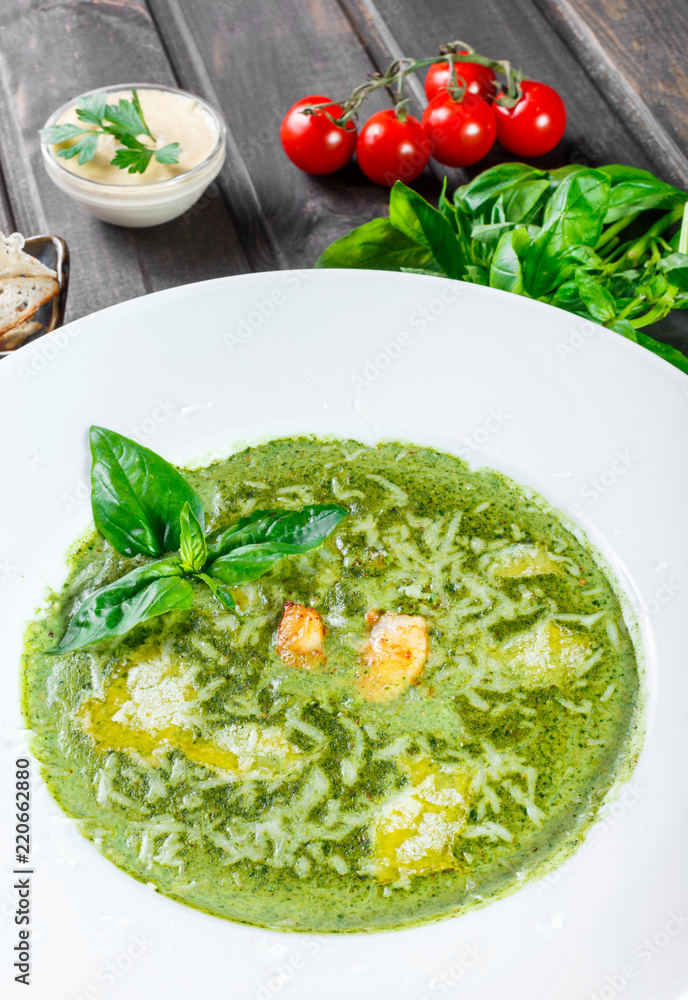 Seafood Soup with shrimp, cheese parmesan, herbs and lemon on plate on dark wooden background. Thai traditional food