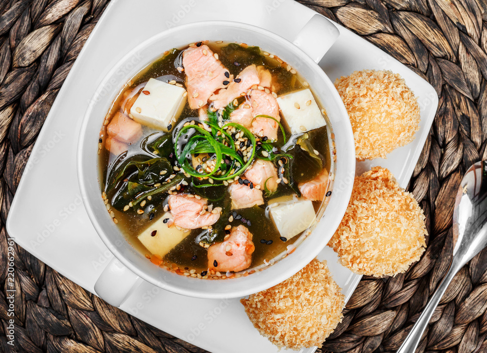 Seafood Soup with salmon, cheese, seaweed, sesame and bread on plate on wooden background. Mediterranean food.