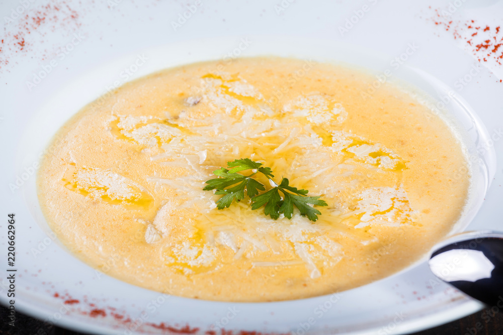 Cream soup with cheese parmesan, herbs and chicken on plate on dark wooden background. Homemade food. Ingredients on table