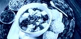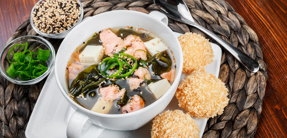 Seafood Soup with salmon, cheese, seaweed, sesame and bread on plate on wooden background. Mediterranean food.