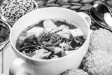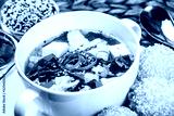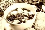 Seafood Soup with salmon, cheese, seaweed, sesame and bread on plate on wooden background. Mediterranean food.