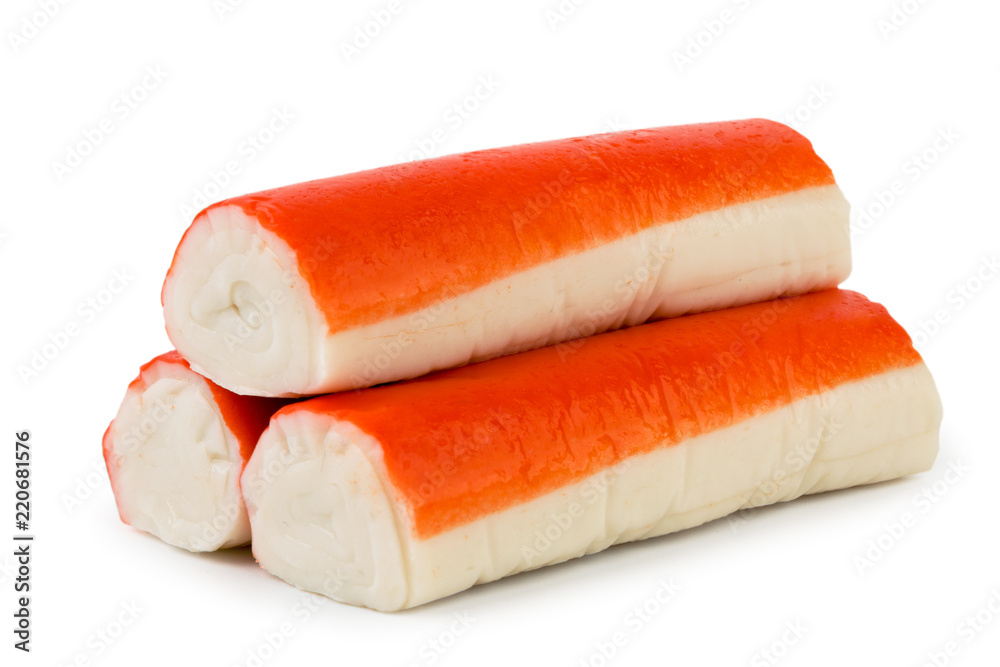 Three crab sticks close up on a white. Isolated