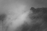 View of morning fog in the mountains. Misty landscape of rocky mountain slopes. Color toning and low contrast. Outdoor travel background.