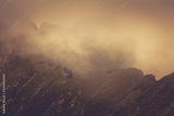 View of morning fog in the mountains. Misty landscape of rocky mountain slopes. Color toning and low contrast. Outdoor travel background.