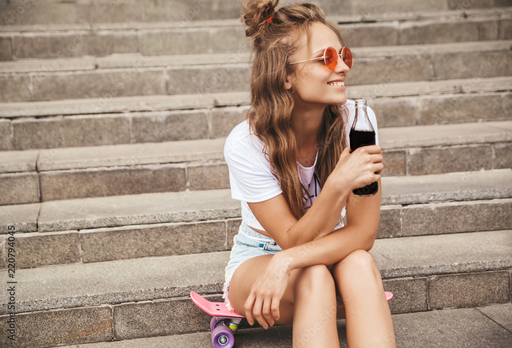 Beautiful cute blond teenager model in summer hipster white clothes sitting on pink penny skateboard on stairs. Drinking soda from bottle