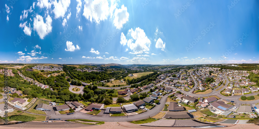 Aerial 360 degree panorama of the Welsh valleys town of Ebbw Vale in South Wales, United Kingdom