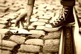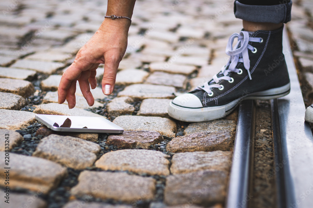 smartphone fell on a cobbled street, woman lifting a smartphone from a cobblestone street before is tramway arrival