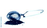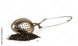 A bunch of black tea leaves and a teaspoon on a white background. Isolated