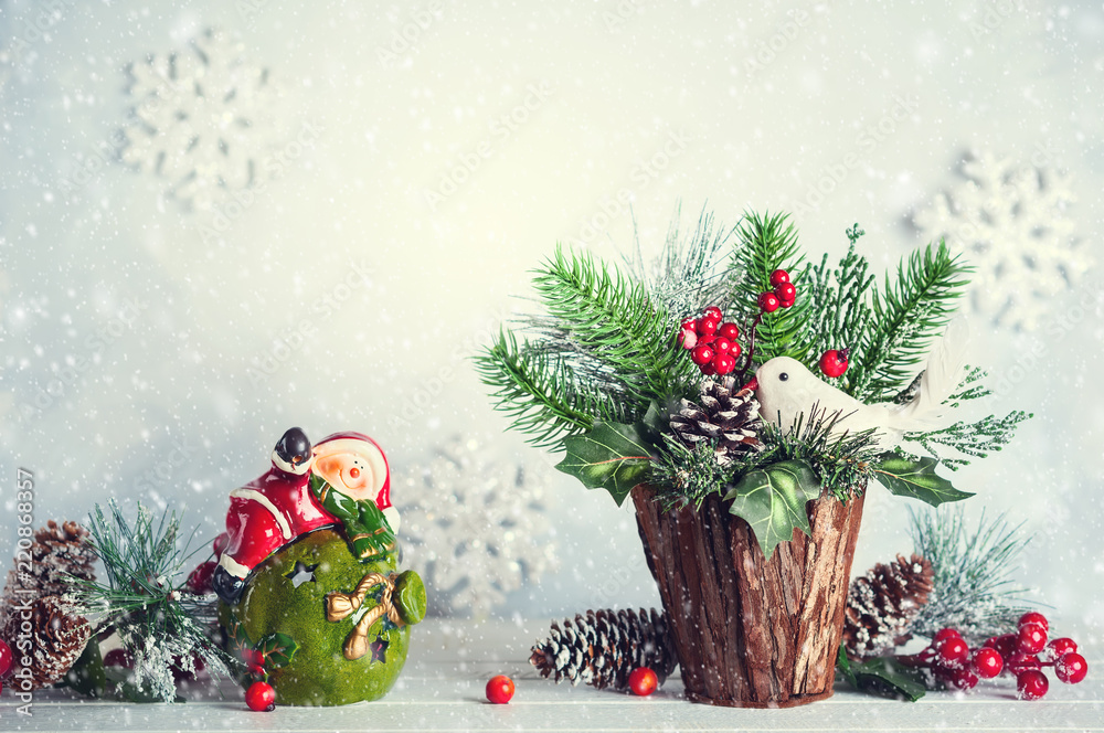 Christmas and New year still life with festive decor on the wooden background. Christmas bunch, snowflakes