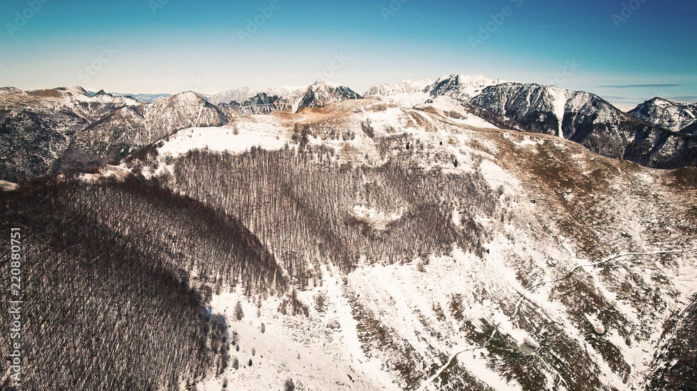 Road winds through the hills partially covered with snow.