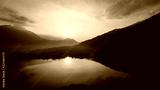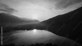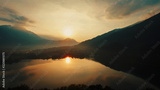 Lake sunset view. magic hour. golden dusk sky. aerial view. Levico Italy