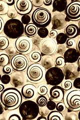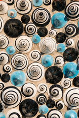 Texture of ceramic in the shape of cones painted with figures of spirals.