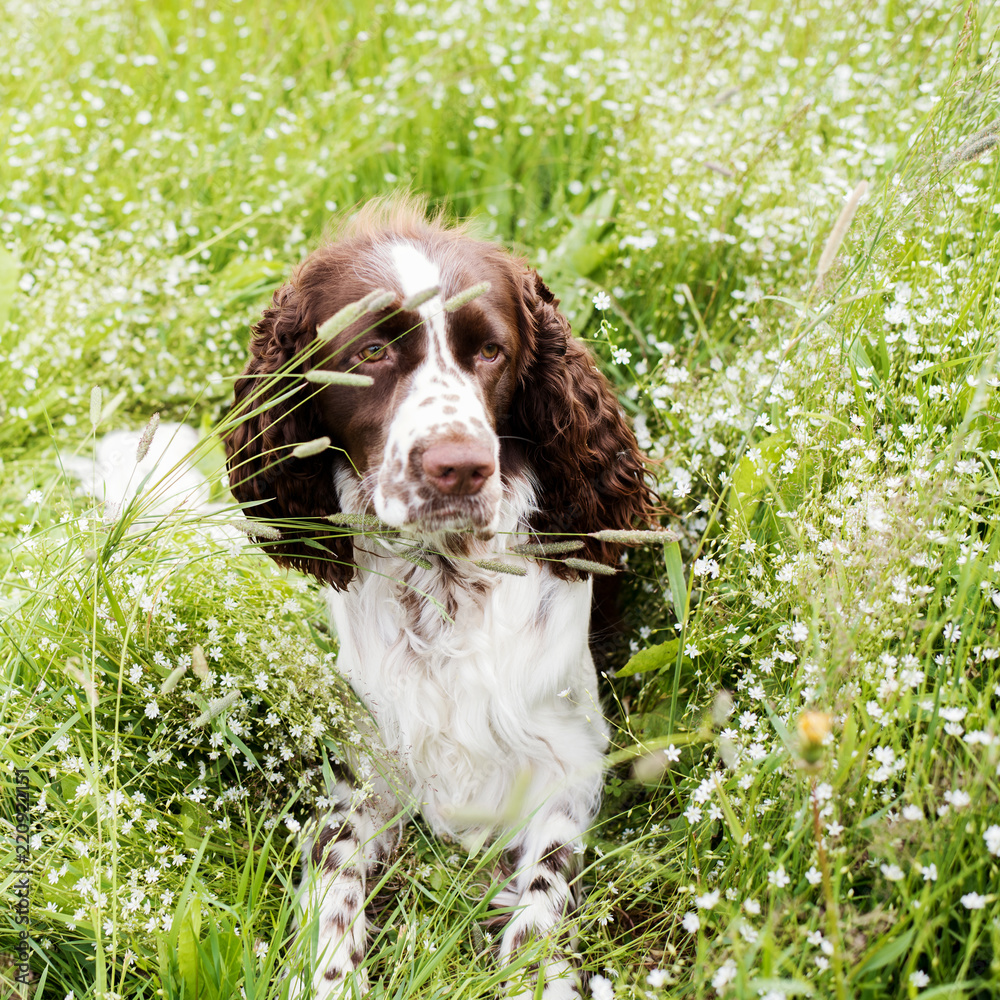 Springer spaniel dog resting in the grass with his tongue hanging out