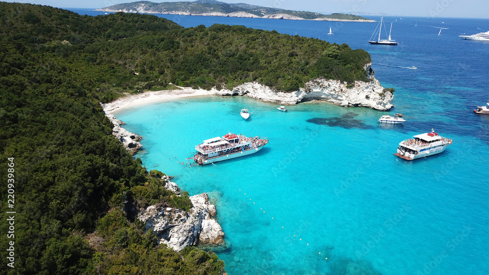 Aerial bird's eye view photo taken by drone of tropical rocky caribbean seascape with sandy beach with turquoise clear waters and small trees