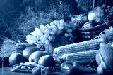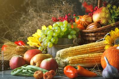 Happy Thanksgiving Day background, wooden table decorated with Pumpkins, Maize, fruits and autumn leaves. Harvest festival. Selective focus. Horizontal.
