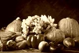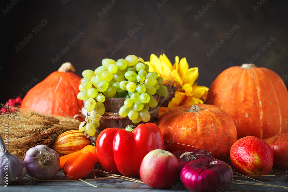 Happy Thanksgiving Day background, wooden table decorated with Pumpkins, Maize, fruits and autumn leaves. Harvest festival. Selective focus. Horizontal.