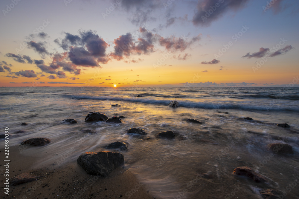 Romantic sunset over the sea beach, baltic sea, Poland