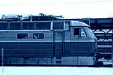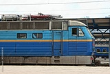 a large blue locomotive stands at the station on the railway