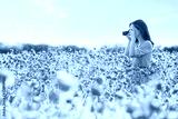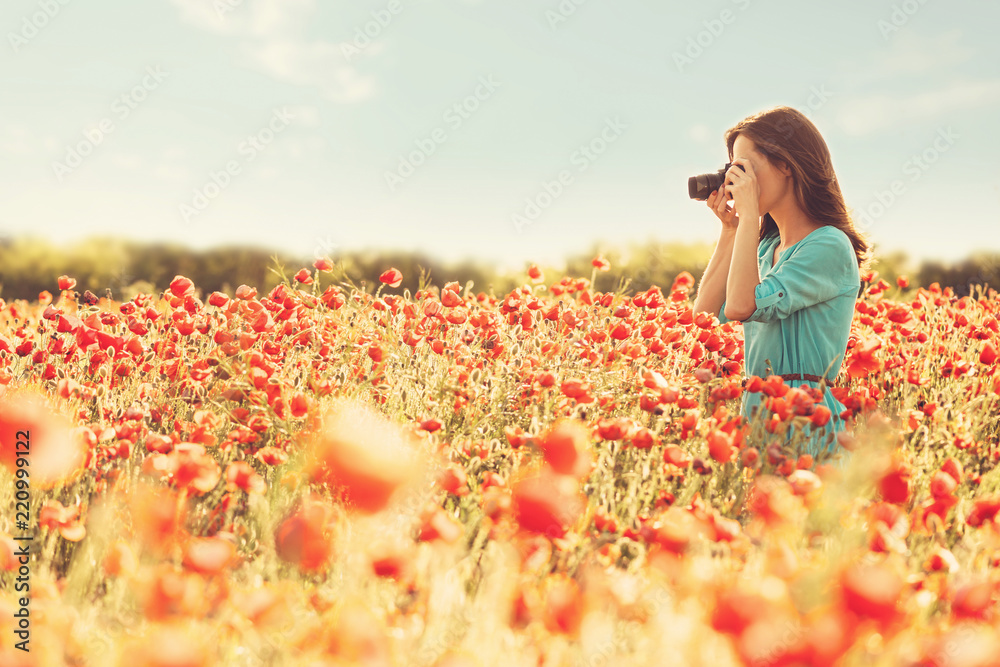 Girl taking photographs with camera in flower meadow.