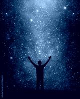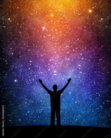 Man silhouette on a night sky background with bright stars. Man watching the stars. Science, education and religion team concept background. Elements of this image furnished by NASA.