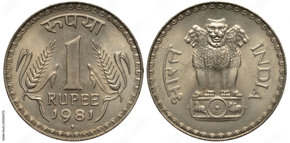 India Indian coin 1 one rupee 1984, regular issue, value and date flanked by grain ears, Asoka lion pedestal,