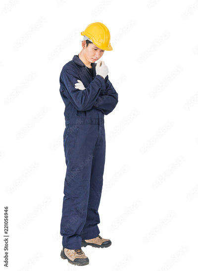 Workman with blue coveralls and hardhat in a uniform with clipping path