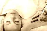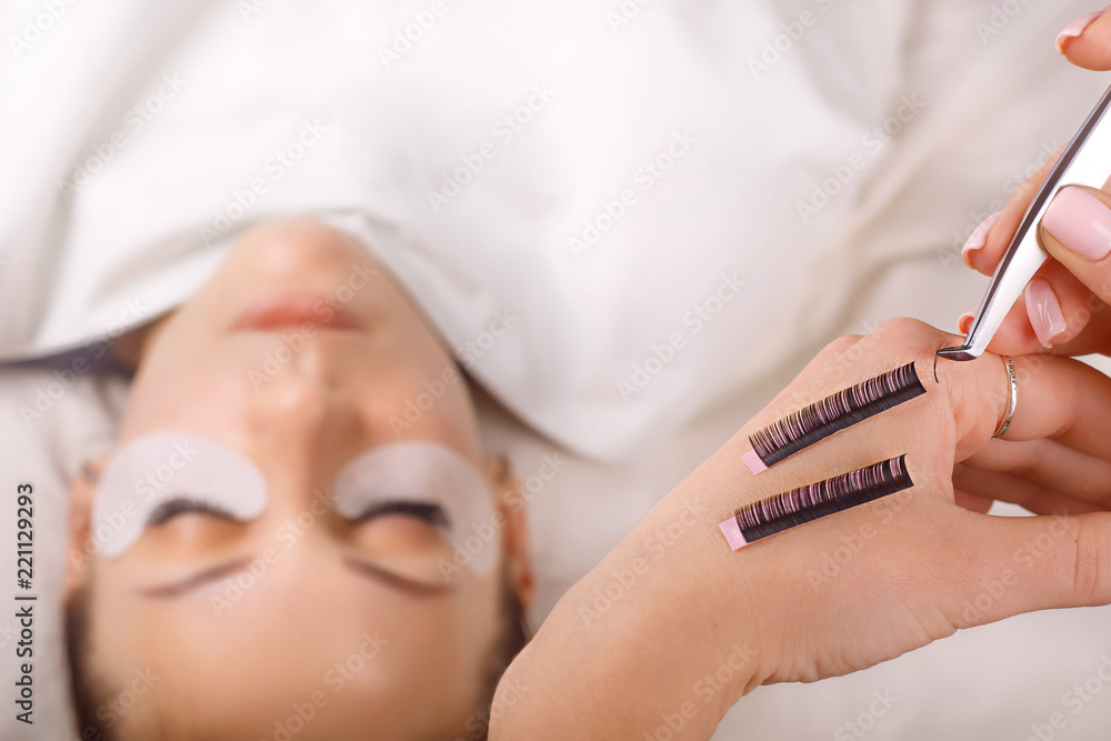 Eyelash Extension Procedure. Woman Eye with Long Eyelashes. Close up, selective focus.
