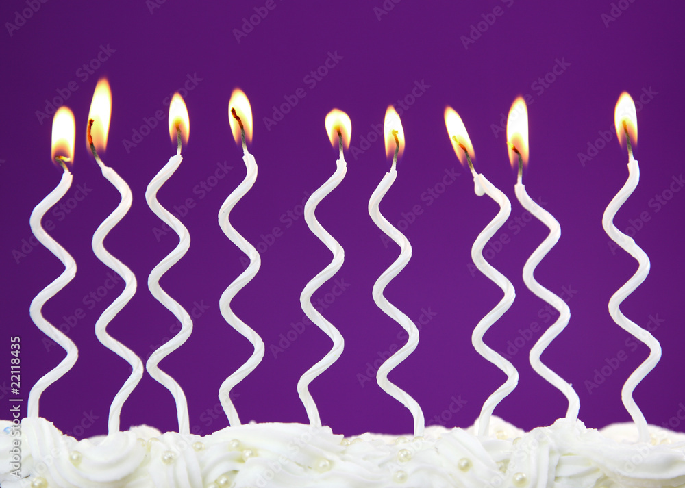 White birthday candles on lilac background