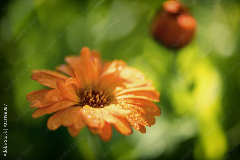 Bright summer background with growing flowers calendula, marigold.