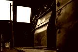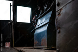 Rusty and dilapidated driver's house of an old train locomotive at ubex location with authentic industrial details and craftsmanship along the rail way and station
