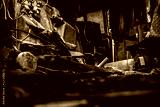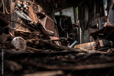Rusty and dilapidated driver's house of an old train locomotive at ubex location with authentic industrial details and craftsmanship along the rail way and station